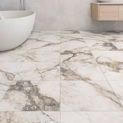 Elevate your interiors with the Calacatta Tempest Heavy Polished Porcelain Marble Effect 600x600mm Wall and Floor Tile, a luxurious choice for those seeking timeless style and everyday practicality. Showcasing a white marble effect with striking heavy Calacatta veining in deep grey and warm beige, this tile captures the natural beauty and variation of authentic marble while delivering all the benefits of premium porcelain.