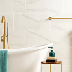 Crafted from high-quality porcelain, the Carrara Serena tiles are hardwearing, long lasting, and easy to clean, offering the luxury of marble without the maintenance.