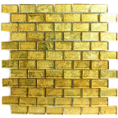 Transform your space with the Golden Brick Gold Glass Mosaic Wall Tile. This luxurious mosaic features small rectangular glass pieces in a rich gold hue, arranged in a classic brick pattern. Each tile showcases intricate lining and detailed glasswork, adding depth and sophistication to your design.