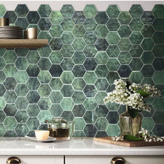 Bring a touch of high-end elegance to your home with the Portofino Green Hexagon Polished Porcelain Tile. Designed to make a statement, this stunning tile features multiple shades of green, adding depth, dimension, and character to any space.