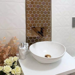 Add a touch of glamour to your space with the Rose Gold Hexagon Metal Mosaic Tile. Each sheet measuring at 300x300mm, this stunning mosaic is crafted from real metal and features a stylish mix of plain rose gold hexagon pieces and intricately detailed floral hexagons. The result is a bold, eye-catching design that brings luxury and personality to any interior.