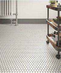 Elevate your interiors with the Shapes Hexagon White Hexagon Mosaic Tile, a modern twist on the classic penny mosaic. Instead of traditional circular patterns, this design embraces on-trend hexagonal shapes, adding a contemporary edge to any space.