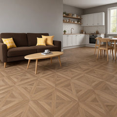 The smooth matt finish adds a calming, tactile elegance, diffusing light softly across the floor for a serene and high-end aesthetic. With its 600×600mm (60×60cm) large format, the parquet pattern gains structure and clarity while reduced grout lines create a clean, continuous look. Combined with the warm oak colour, this format helps rooms feel more open and spacious — perfect for open-plan kitchens, dining areas, and modern living rooms.