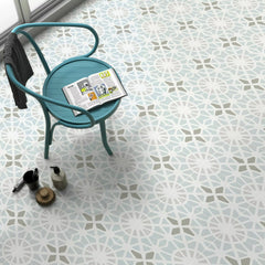 Ideal for bathrooms and kitchens, this floor tile offers a classic and refined look, with its soft blue tones and intricate star pattern bringing a sense of elegance and warmth to any room. The Chloe Collection is also available in grey and green, offering versatile options to complement your design style.