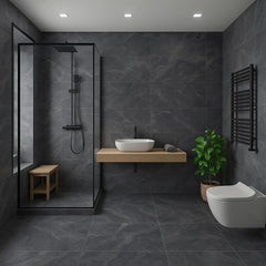 The rich grey tones create a sophisticated, grounding atmosphere, making it an ideal choice for bathrooms, kitchens, and living spaces. With a matt finish and an R10 anti-slip rating, this tile offers both style and safety underfoot, perfect for wet areas and high-traffic zones.